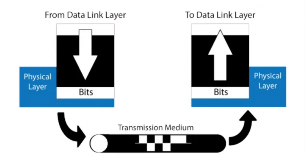 • Truyền dữ liệu: Chuyển đổi các bit thành tín hiệu vật lý để truyền qua các phương tiện truyền thông như cáp đồng trục, cáp xoắn đôi, cáp quang hoặc sóng vô tuyến. Tầng này xác định các quy tắc về tốc độ truyền, đồng bộ hóa, kích thước Frame dữ liệu, phạm vi tín hiệu và các thông số vật lý khác.